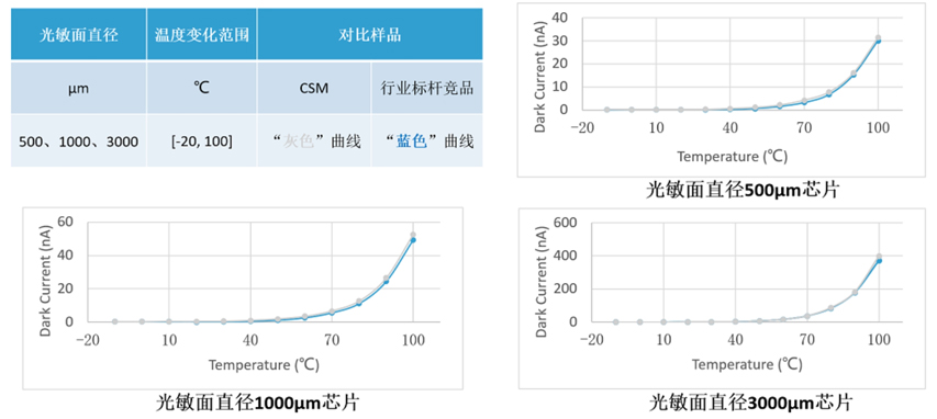 与此同时,VSport-胜利还兼顾了大尺寸MPD芯片的性能表现,实现真正意义上的降本增效,做出了比肩业内标杆企业的产品。图2为室温下测得的芯片级MPD产品的暗电流、结电容及响应度数据。即便对于直径3000μm的芯片,暗电流的均值也在3nA级别,相同测试条件下满足甚至低于市面常见规格。暗电流随温度变化的稳定性,是表征芯片工作特性的重要指标。芯片在封装结束后,在变温条件下测试后,VSport-胜利MPD芯片展现出与行业标杆企业同等水平的温度稳定性。图3是[-20,100]℃下测得MPD芯片温度稳定曲线,对于500μm的芯片,在100℃时,暗电流只比-20℃下高约30nA。
